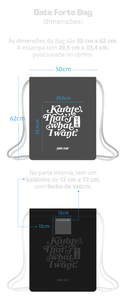 Chega de carregar seus equipamentos de um lado para o outro de forma desorganizada! A Bate Forte Bag é a mochila perfeita para karatecas oferecendo praticidade e organização em um só lugar. Seja você um competidor experiente ou um iniciante dedicado, a Bate Forte Bag tem espaço para tudo que você precisa. Protetores, karate gi e também um bolsinho interno para o seu protetor bucal. Para quem busca organização máxima, a Bate Forte Bag oferece opções nas cores AO (azul) e Aka (vermelho), permitindo que você guarde seus kits de forma separada. Agora se você prefere uma bag mais versátil, a Kuro (preta) é a escolha ideal. As dimensões da Bate Forte Bag são: 50 cm x 62 cm.